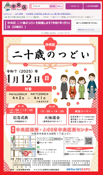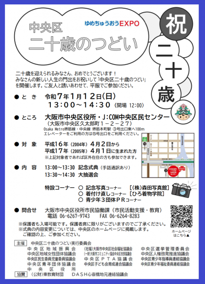 【令和7年1月12日(日曜日)】中央区 二十歳のつどい を開催します(中央区役所WEBページより転載します)