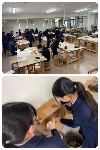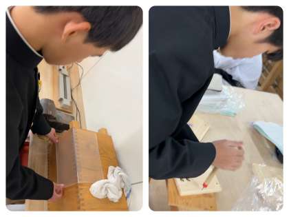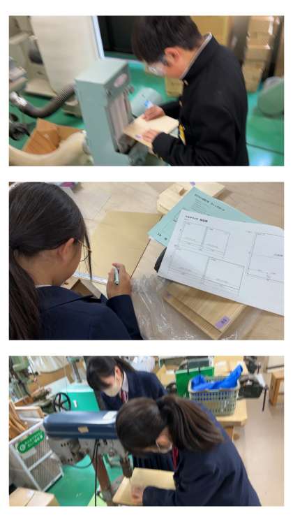 1年生の技術の授業では、ものづくり実習として『マルチラック』を製作しています。図面を見ながら、線を入れ、切ったり、曲げたり、穴を開けたりしながら、安全に留意して作業をしています。完成が楽しみです。