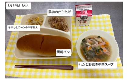 本日の給食では、「鶏肉のからあげ・ハムと野菜の中華スープ・もやしとコーンの中華あえ・黒糖パン・牛乳」が提供されます。寒い日ですので、温かい中華スープは嬉しいです。