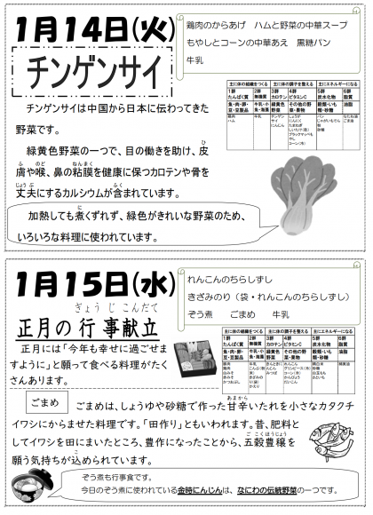 明日は、「れんこんのちらしずし・きざみのり・ぞう煮・ごまめ」のお正月献立が提供されます。お楽しみに。