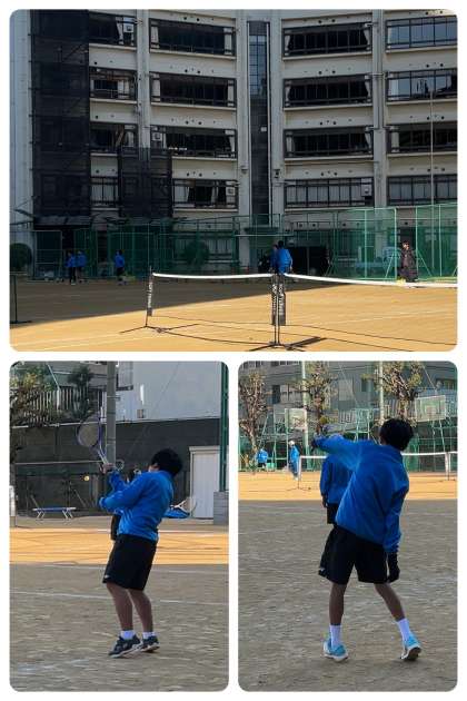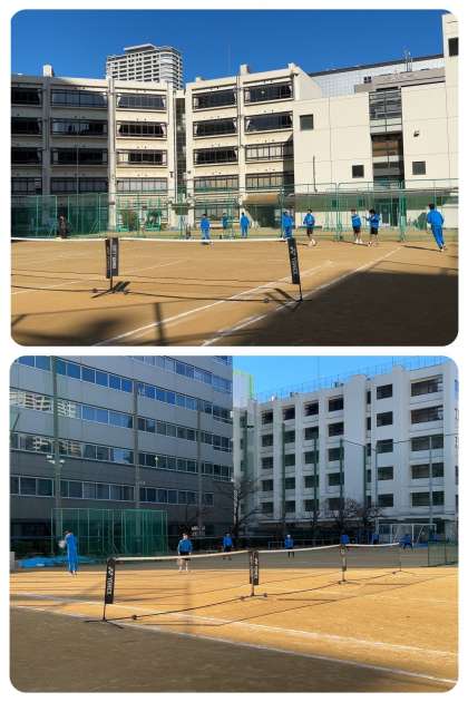 男子ソフトテニス部が、運動場に4面のコートを使って練習をしました。女子は研修大会に出かけています。男女ともに春季大会に向けて、練習を重ねます。