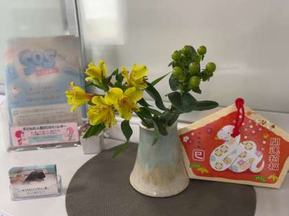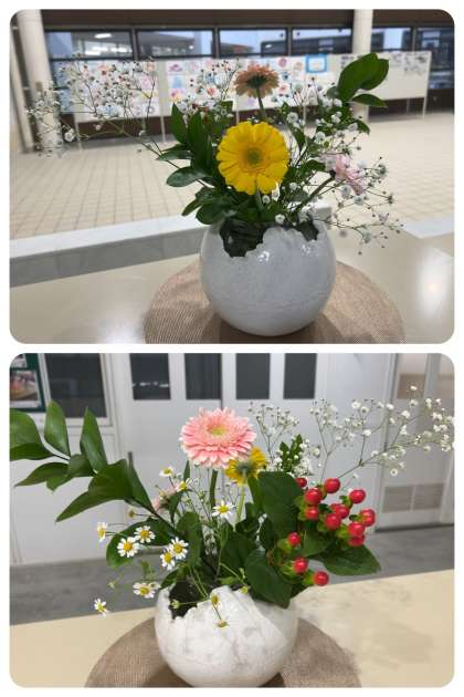 さて、玄関ホールにはガーベラ、かすみ草、マトリカリア、ヒペリカム、ラスカスが、職員さん前にはマストロメリアとヒペリカムを生けていただきました。いつもありがとうございます。