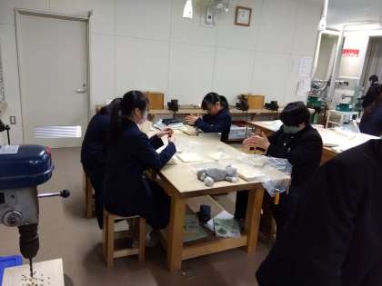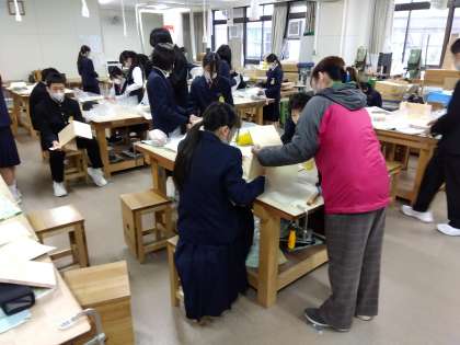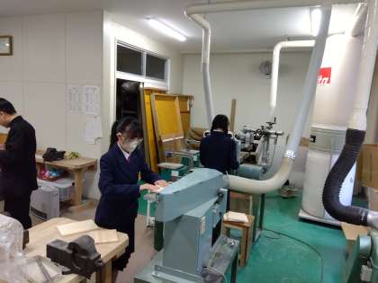 1年技術:木工に取り組んでいます。キリで穴をあけたり、やすりをかけたりとそれぞれが作業の進捗によって異なった作業をしています。自分たちでよく考えて作業を進めていました。