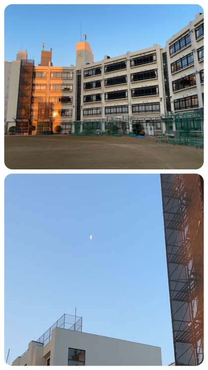 朝の澄み渡った青空に、『下弦の月』を校舎の上に見ることができます。今日も寒い朝を迎えました。
