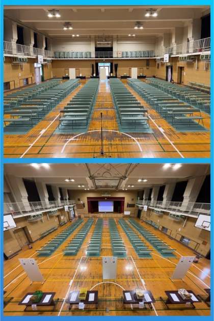 説明会の会場を3年生各クラスの班長の皆さんが設えてくれました。新入生保護者の皆さまのご来校をお待ちしております。14時から約1時間を予定しています。NHK側(東門)の通用門よりお入りください。また、足元を暖かくしてお越しください。