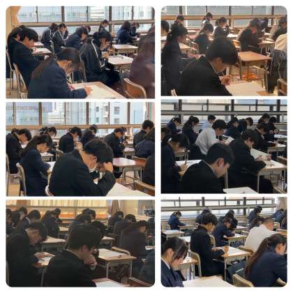 3年生は学年末テストの2日目です。英語のリスニングテストでは、集中して放送を聞き、考え、答えを記入しています。