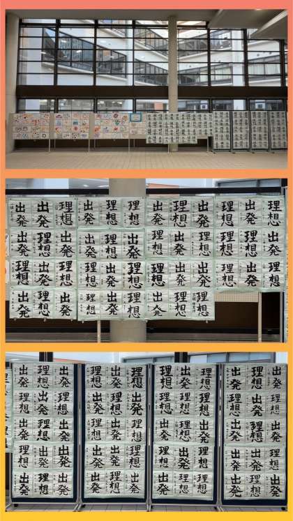 玄関ホールに、美術の作品と並んで、1年生の書道の作品が掲出されています。個性が滲む、力強い字ばかりです。