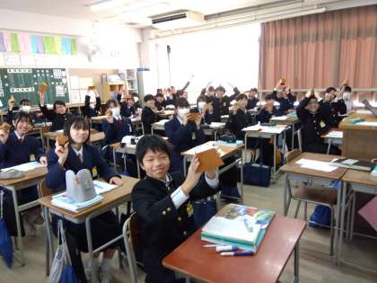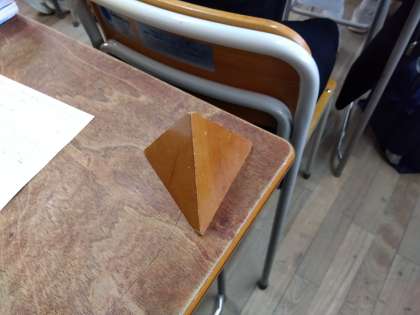 1年数学:立体図形の学習をしています。さまざまな形の木製の図形を使ってその名称と特徴を考えています。楽しく取り組むことができていますた。