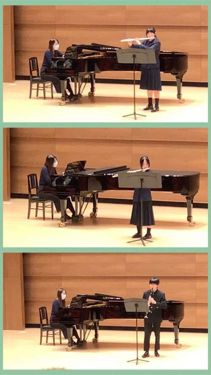 吹奏楽部の4人のメンバーが、第29回全日本中学生ソロコンテスト『関西大会』予選に出場しました。ピアノ伴奏は、お一人で4人の伴奏を引き受けていただきました。ありがとうございました。Flが2人、Cl、Mariの4人が、大阪成蹊大学の真新しい『こみちホール』に素敵な東中サウンドを響かせました♪