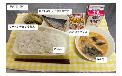 本日の給食では、「さごしのしょうゆだれかけ・みそ汁・キャベツの赤じそあえ・おさつチップス・ごはん・牛乳」が提供されます。給食をしっかりいただいて、寒さや感染症に負けない健康の保持増進に努めましょう。