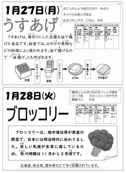 「学校給食感謝の日(12月24日)」は、戦後、中断されていた学校給食が再開されたことを記念した日です。そして、昭和25年度から冬期休業と重ならない1月24日から30日までが「全国学校給食週間」となりました。私たちが日頃食べている給食は栄養バランスの良い豊かな食事ですが、昔は、今のような様々な食材を使った給食ではありませんでした。この機会に、学校給食の歴史を振り返り、食べ物の大切さや作る人の思いを考え、感謝の気持ちで食事をしましょう。