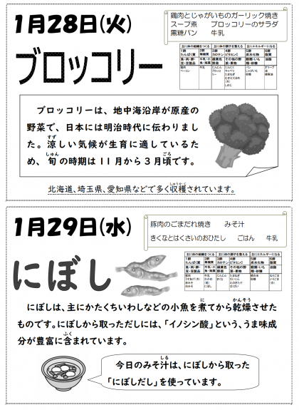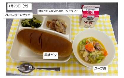 本日の給食では、「鶏肉とじゃがいものガーリック焼き・スープ煮・ブロッコリーのサラダ・黒糖パンん・牛乳」が提供されます。給食をしっかりいただいて、寒さや感染症に負けない健康の保持増進に努めましょう。