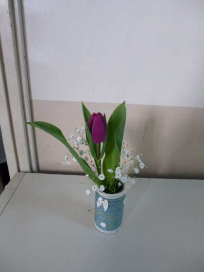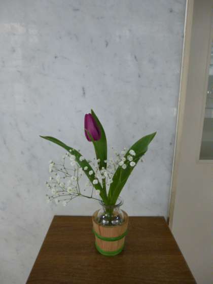事務室前、職員室前にあるお花は、学校支援ボランティアの松本さんが生けてくださっています。チューリップとかすみ草の可愛らしいコンビです。チューリップのつぼみは、まだ開くまでに時間がかかりそうですが、これからゆっくりと開いていくでしょう。