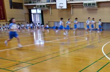 1年体育:男女とも体育館でシャトルランを行いました。粘り強く取り組んでいました。