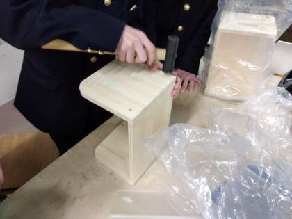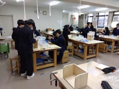 1年技術:木工で本棚の作成をしています。だんだんと仕上げの作業に入っています。