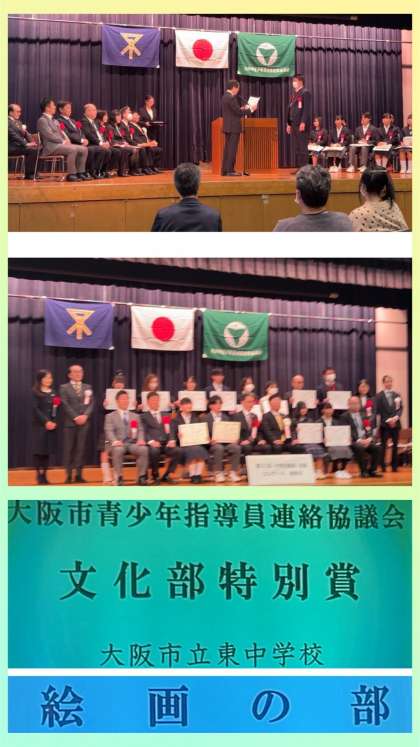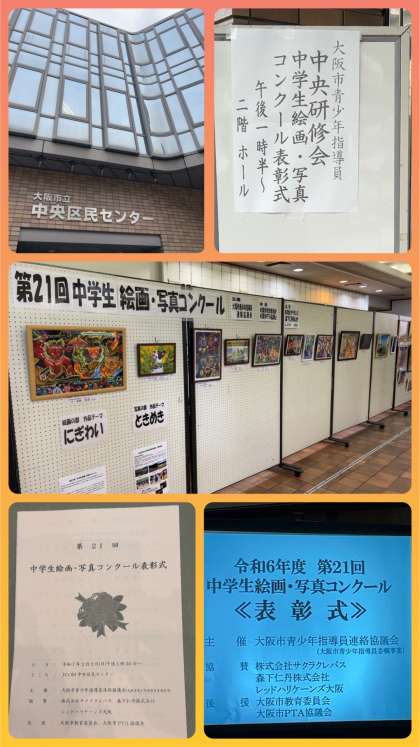 中央区民センターで、第21回中学生絵画・写真コンクール表彰式が行われ、『にぎわい』をテーマに応募した本校3年生の絵画作品が、見事に特別賞【大阪市青少年連絡協議会文化部特別賞】に輝きました。おめでとうございます。