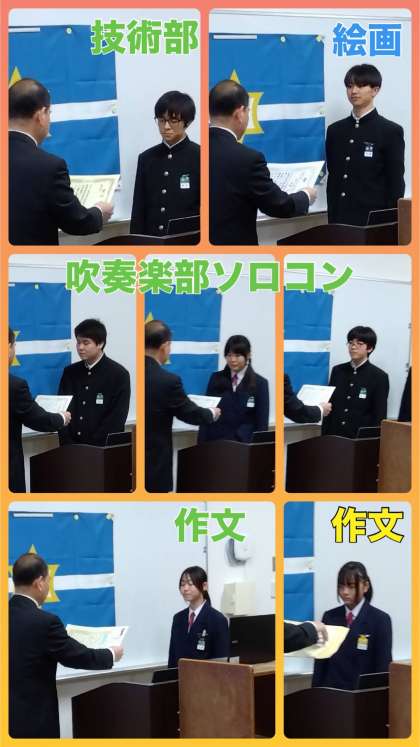 2月3日立春。全校集会をリモートで行いました。まず初めに伝達表彰。全国大会に出場した技術部員へ、続いて、絵画の作品へ、そして、吹奏楽部のソロコンテストのメンバー、作文の表彰と伝達を行いました。素晴らしい実績ですね。おめでとうございました。