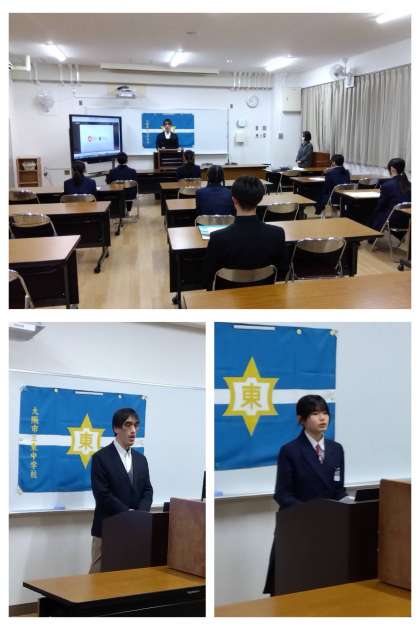 校長先生からは、表彰者の様子をホームページの記事を使いながら説明がありました。また、先週1・2年生が取り組んだ万博の学習とSDGsの学習をふまえて、万博に向けての説明がありました。結びには、入試が本格化する3年生へ、くれぐれも健康に留意して挑みましょうとのエールが送られました。