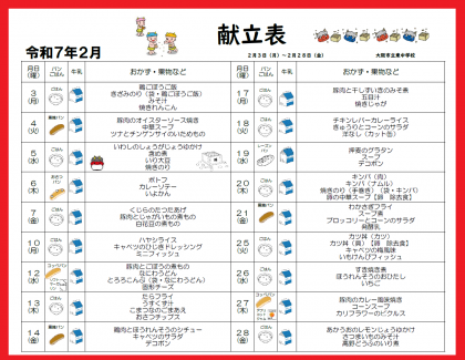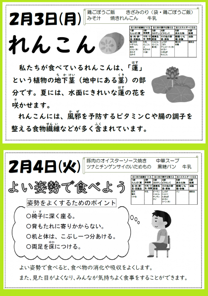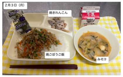 本日2月3日立春の日の給食は「鶏ごぼうご飯・きざみのり(袋・鶏ごぼうご飯)・みそ汁・焼きれんこん・牛乳」が提供されます。給食をしっかりいただいて、寒さや感染症に負けない健康の保持増進に努めましょう。