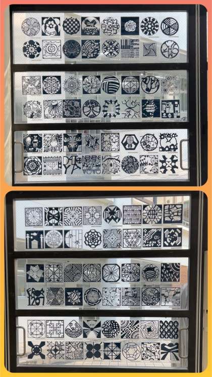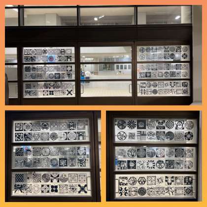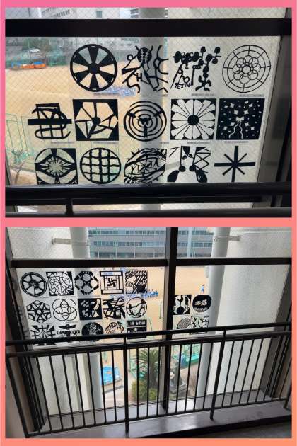 玄関ホールと階段踊り場のガラス面に3年生の作品が掲出されています。個性的な作品は、観る時間によって趣が変化します。素敵な作品たちです。