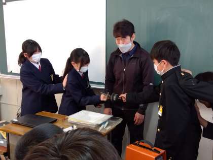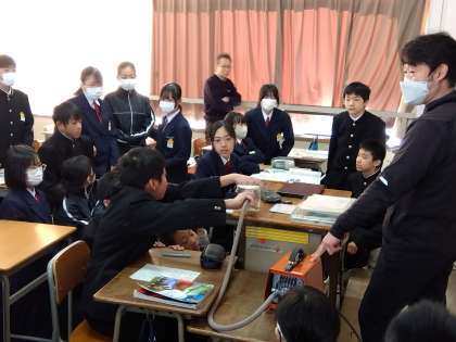 1年理科:真空ポンプを使って真空の性質を体験しました。お菓子の袋がふくらむ様子を観察したり真空にした鉄球を引っ張ったりして気圧の大きさを感じることができました。
