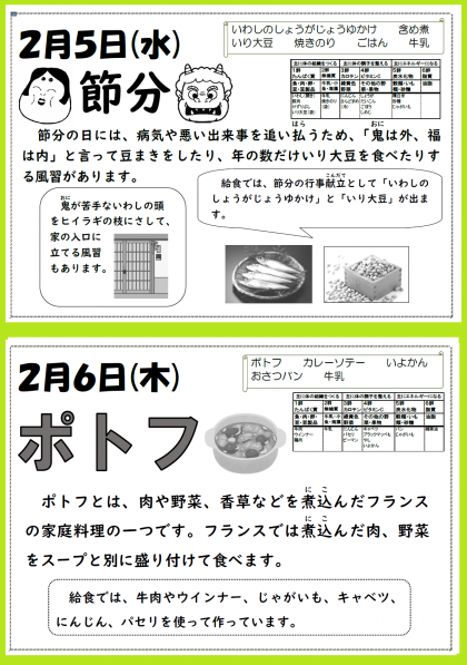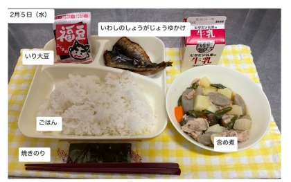節分の日(今年は2月3日でした)には、病気や悪い事を追い払うため、「鬼は外、福は内」と言って豆まきをしたり、年の数だけ『いり大豆』を食べたりする風習があります。また、鬼が苦手ないわしの頭をヒイラギの枝にさして、家の出入り口立てる風習もあります。今日は、節分行事献立として『いわしのしょうがじょうゆかけ』と『いり大豆』が出ます。給食をしっかりいただいて、寒さや感染症に負けない健康の保持増進に努めましょう。