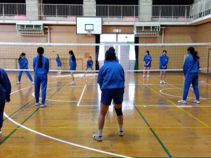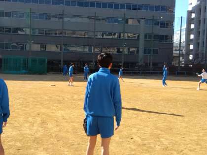 3年体育:男子は運動場でソフトボール、女子はバレーボールに取り組みました。