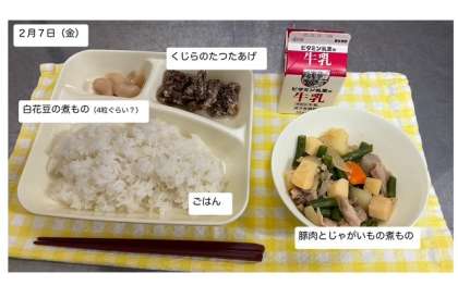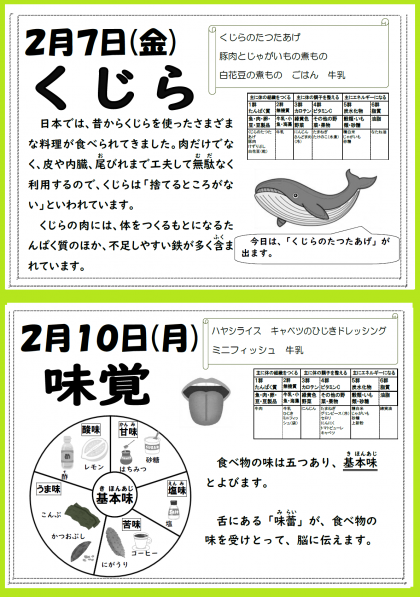 本日の給食は「くじらのたつたあげ・豚肉とじゃがいもの煮もの・白花豆の煮もの・ごはん・牛乳」が提供されます。『くじら』の肉には、鉄分が多く含まれています。給食をしっかりいただいて、寒さや感染症に負けない健康の保持増進に努めましょう。
