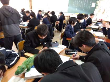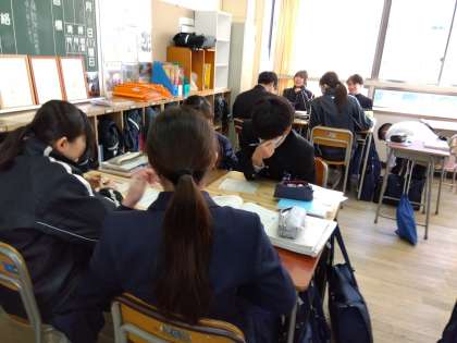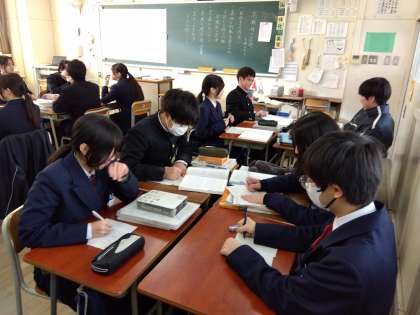 3年国語:「高瀬舟」の主題は何かを自分で考えワークシートにまとめた後、班で意見の交流をしました。