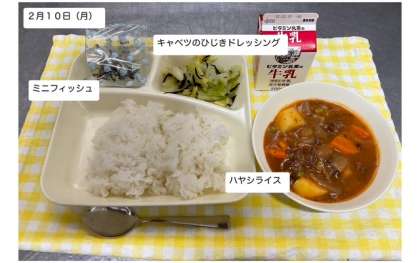 本日の給食は「ハヤシライス・キャベツのひじきドレッシング・ミニフィッシュ・牛乳」が提供されます。熱々の給食をしっかりいただいて、寒さや感染症に負けない健康の保持増進に努めましょう。