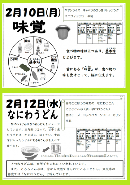 明日は「豚肉とごぼうの煮もの・なにわうどん・とろろこんぶ(袋)・固形チーズ・コッペパン・ソフトマーガリン・牛乳」が提供されます。「きつねうどん」は大阪で生まれたといわれています。また、「とろろこんぶ」は、昔から大阪で作られていることから、大阪市の給食では「なにわうどん」と呼んでいます。お楽しみに。