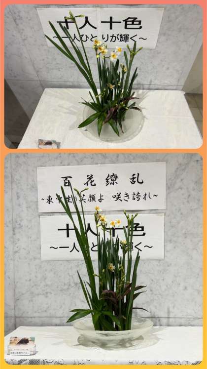玄関のお花を生け替えていただきました。お題は『雪中花』。お花は『水仙とドラセナ』です。いつもありがとうございます。