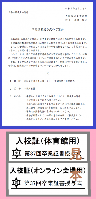 お子さまの卒業おめでとうございます。本日、卒業式の案内とともに入校証を2枚(桜色と空色)お届けします。ご家庭で管理していただき、卒業式当日、ご持参ください。会場の都合で、卒業生ひとりにつき、同居するご家族、体育館に1名とリモート会場(新校舎6階)に1名の参加とさせていただきますことをご承知ください。なお、在校生の兄弟姉妹の参列につきましても、例年通りご遠慮いただきますようお願いします。