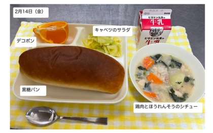 本日の給食は「鶏肉とほうれんそうのシチュー・キャベツのサラダ・デコポン・黒糖パン・牛乳」が提供されます。アツアツの「シチュー」をいただいて、午後の活動に備えましょう。また、寒さや感染症に負けない健康の保持増進に努めましょう。