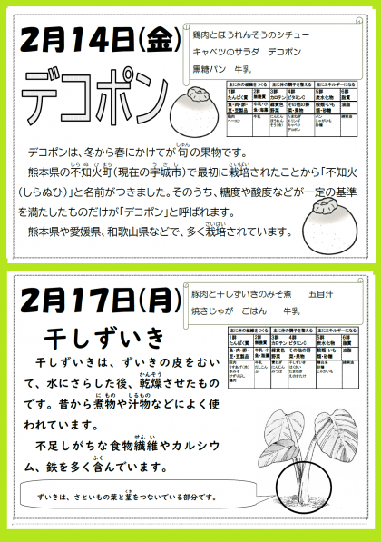 来週、月曜日は「豚肉と干しずいきのみそ煮・五目汁・焼きじゃが・ごはん・牛乳」が提供されます。お楽しみに。