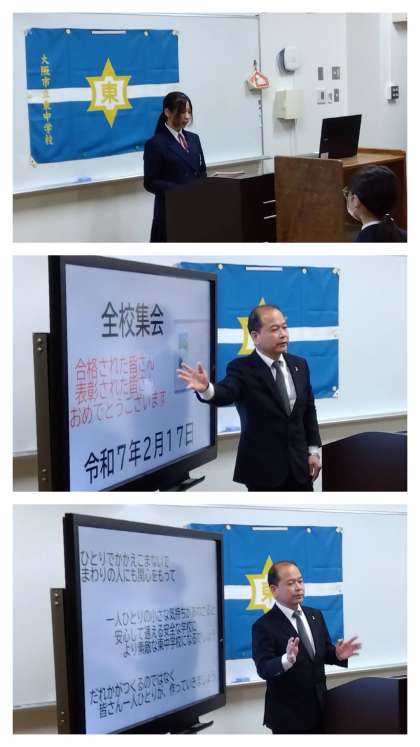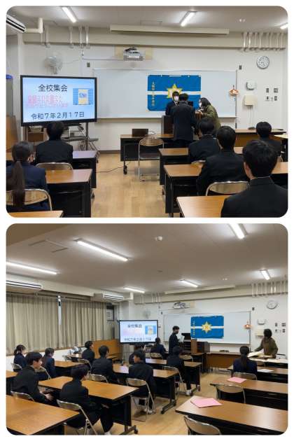 校長先生からは、2月の行事・進路日程の振り返りと今後のスケジュールの紹介がありました。続いて、大阪・関西万博のテーマにもある『いのち』、また『少子高齢化社会』をどう生きていくのかという切り口から『高齢者への虐待』についてお話がありました。そして、『児童虐待』についてのお話のあと、「ひとりで抱え込まずに、必要に応じて各種『相談窓口』を利活用するなど、誰かに『話して』、重荷を『放(離)しましょう』、そして、困っている人がいたら、『大丈夫ですか?』とひと声かけたり、大人に相談したりしましょう」との旨のお話がありました。