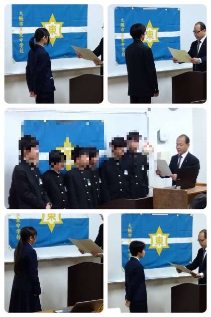 まずはじめに伝達表彰。第11回「伝えよう!いのちのつながり」作文に応募した2年生に『優秀賞』を、『令和7年度国土緑化運動・育樹運動ポスター原画コンクール』に応募した3人もが『佳作』を、男子ソフトテニス部Aチームに『ソフトテニス連盟杯』『第3位』をそれぞれに伝達表彰をしました。受賞された皆さん、おめでとうございます!!さらなる活躍を期待しています。
