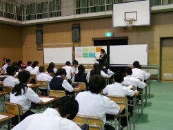 普段は教室で授業が行われるのですが、たくさんの先生方が見に来られるため、体育館での授業となりました。