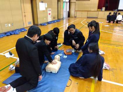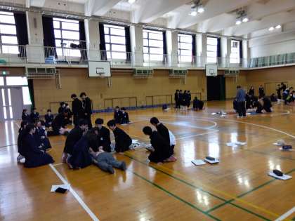 2年保健:応急処置の学習をしています。体育館で心肺蘇生法や三角巾の使い方を確認しました。