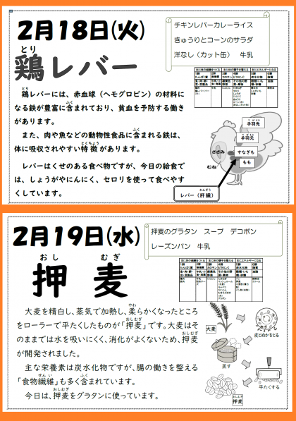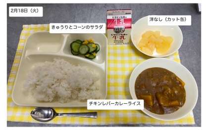 本日の給食は「チキンレバーカレーライス・きゅうりとコーンのサラダ・洋なし(カット缶)・牛乳」が提供されます。アツアツの「カレーライス」をいただいて、午後の活動に備えましょう。また、寒さや感染症に負けない健康の保持増進に努めましょう。