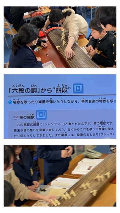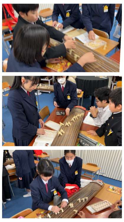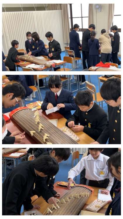 1年生の音楽の授業では、和楽器『筝』の演奏にチャレンジしています。グループにわかれて、先生が調律を済ましてから体験が始まります。和楽器の演奏を通して、日本の伝統芸能の良さを味わいます。