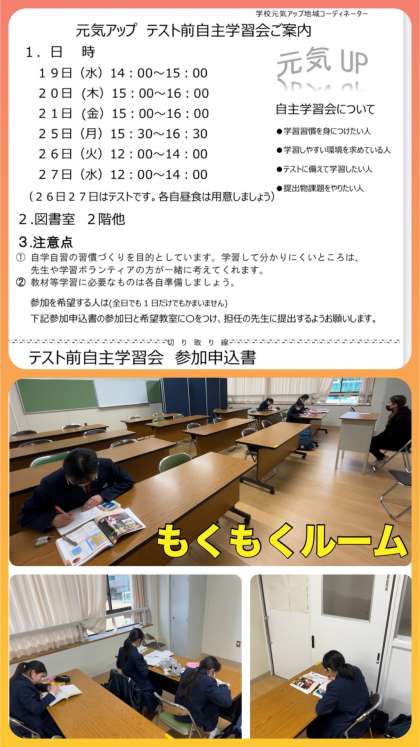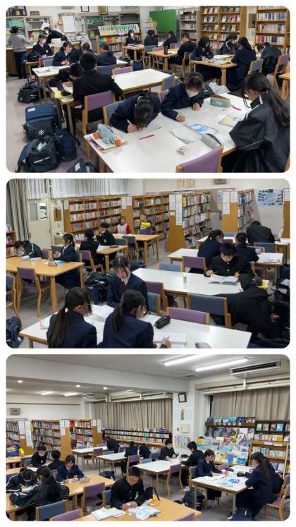 今日から始まった恒例の元気アップテスト前自主学習会。学習スタイルに合わせて、それぞれの部屋で自主学習に取り組みます。懇談で午前中に授業を終えた赤本に取り組む3年生の姿もありました。外は雪が舞い寒さが身体に堪えますが、学習会の部屋は参加者の熱いやる気で溢れていました。