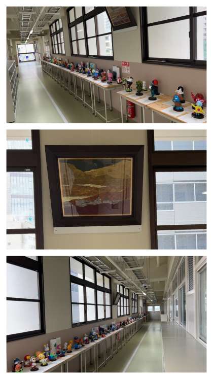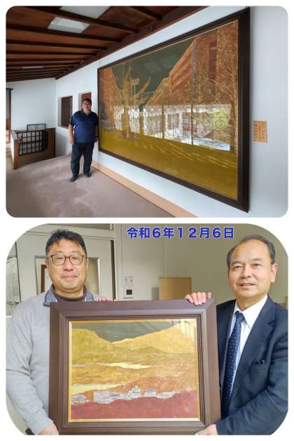 さて、新校舎4階はアートフロアー。美術室と第二美術室があり、廊下には生徒の作品が掲出されています。その廊下の壁に大河内正夫氏が創作した日本画を展示しています。大河内氏は校区にお住まいされていた時期があり、近くの公立高校で美術の教員としても活躍されておられた方です。生徒たちには、間近で、本物の日本画を鑑賞できるスポットができました。この作品は、学校協議委員を務めていただいているもとPTA会長様からのご厚意で、生徒たちに本物を身近に鑑賞させてほしいとの趣旨で掲示することになりました。ありがとうございます。壁一面の『御堂筋』という大作も展示候補でしたが、そちらの作品はその大きさ故に掲出する場所がなく断念しました。美術館等で展示されるときにはぜひ鑑賞ください。
