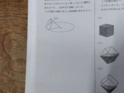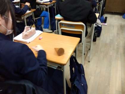 1年数学:円錐の問題に取り組んでいます。実際の立体図形を使ってイメージして問題を解きました。