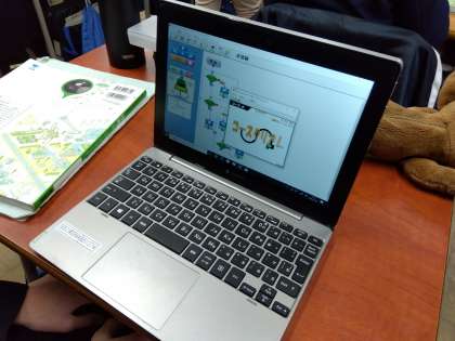 2年技術:フロチャートを作成し、フロチャートに従ってモデルを動かすアプリを使って学習しています。指示どおりに動けば成功です。