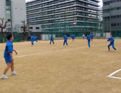 3年体育:女子は体育館でキックベース、男子は運動場でフリスビーをしました。