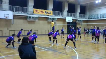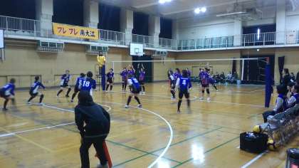 第一セットは互いにレフトにボールを集めて勝負に出ます。最後までもつれましたが、南大江の皆さんが先取しました。