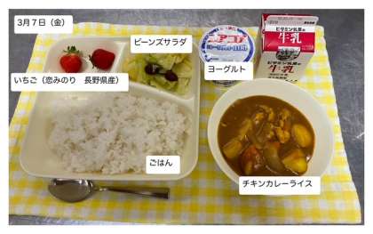 本日の給食は、「チキンカレーライス・ビーンズサラダ・いちご・ヨーグルト・牛乳」が提供されます。給食をしっかりいただいて、健康の保持増進に努めましょう。