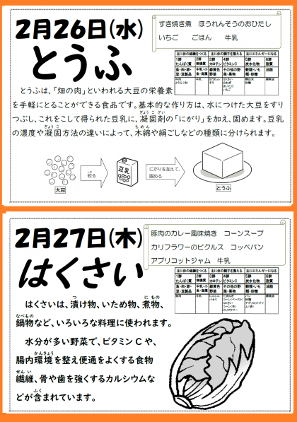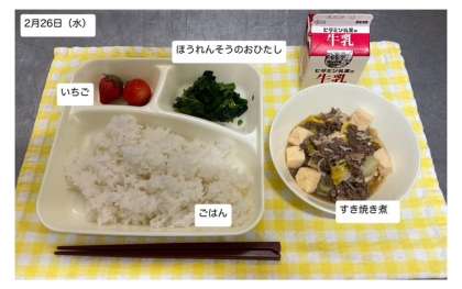 本日の給食は「すき焼き煮・ほうれんそうのおひたし・いちご・ごはん・牛乳」です。しっかり給食をいただいて、午後の活動に備えましょう。また、寒さや感染症に負けない健康の保持増進に努めましょう。