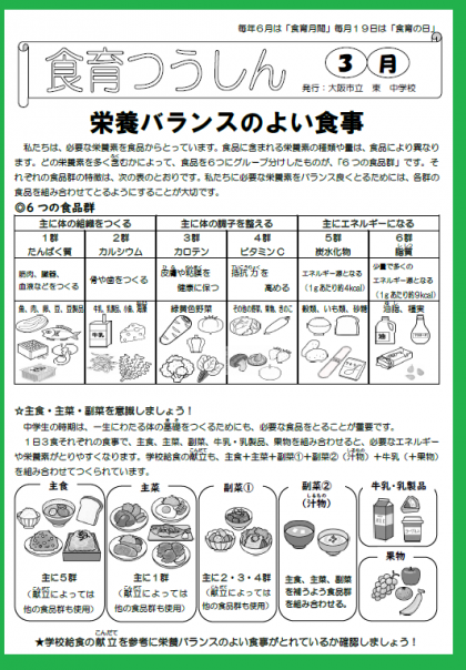 「食育つうしん」はこちらをクリックするとご覧いただけます。今月号では「栄養バランスのよい食事」の見出しで、「6つの食品群」についての記事が掲載されています。「私たちに必要な栄養素をバランス良くとるためには、各群の食品を組み合わせてとるようにすることが大切です。」学校給食の献立を参考に栄養バランスのよい食事がとれているか確認しましょう!